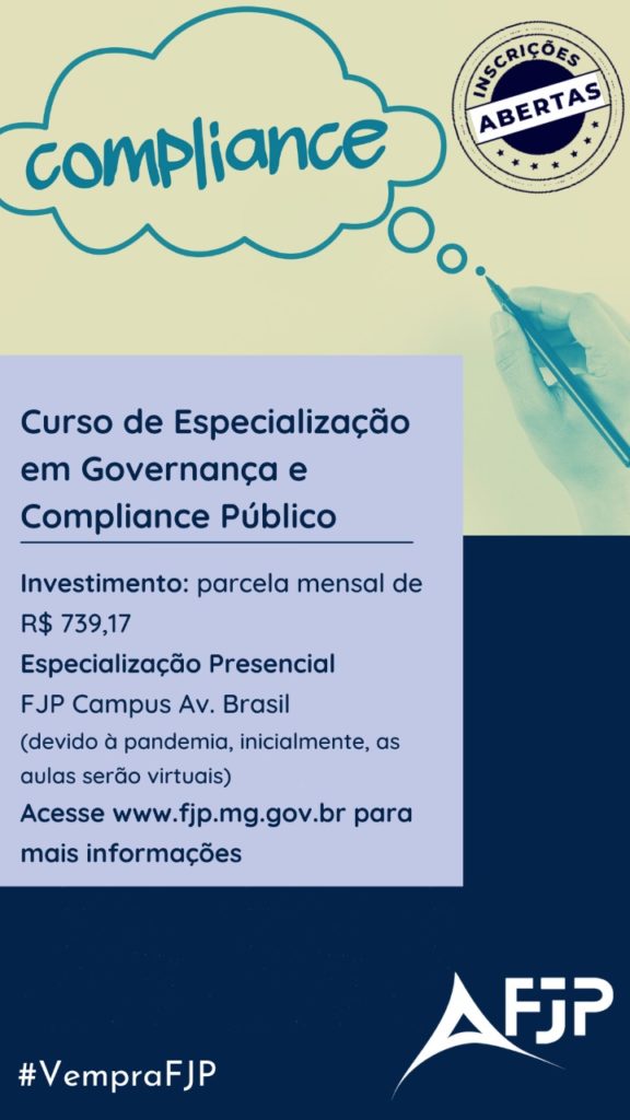 FJP reabre inscrições para processo seletivo de especialização em governança e compliance A Fundação João Pinheiro recebe até 17 de setembro inscrições para o processo seletivo do Curso de Especialização em Governança e Compliance Público . O Edital nº 005/2021, que dispõe sobre o curso, está disponível no site da FJP. As inscrições para a seleção custam R$ 60 e podem ser feitas pelo endereço http://academico2.fjp.mg.gov.br/processoseletivo […]